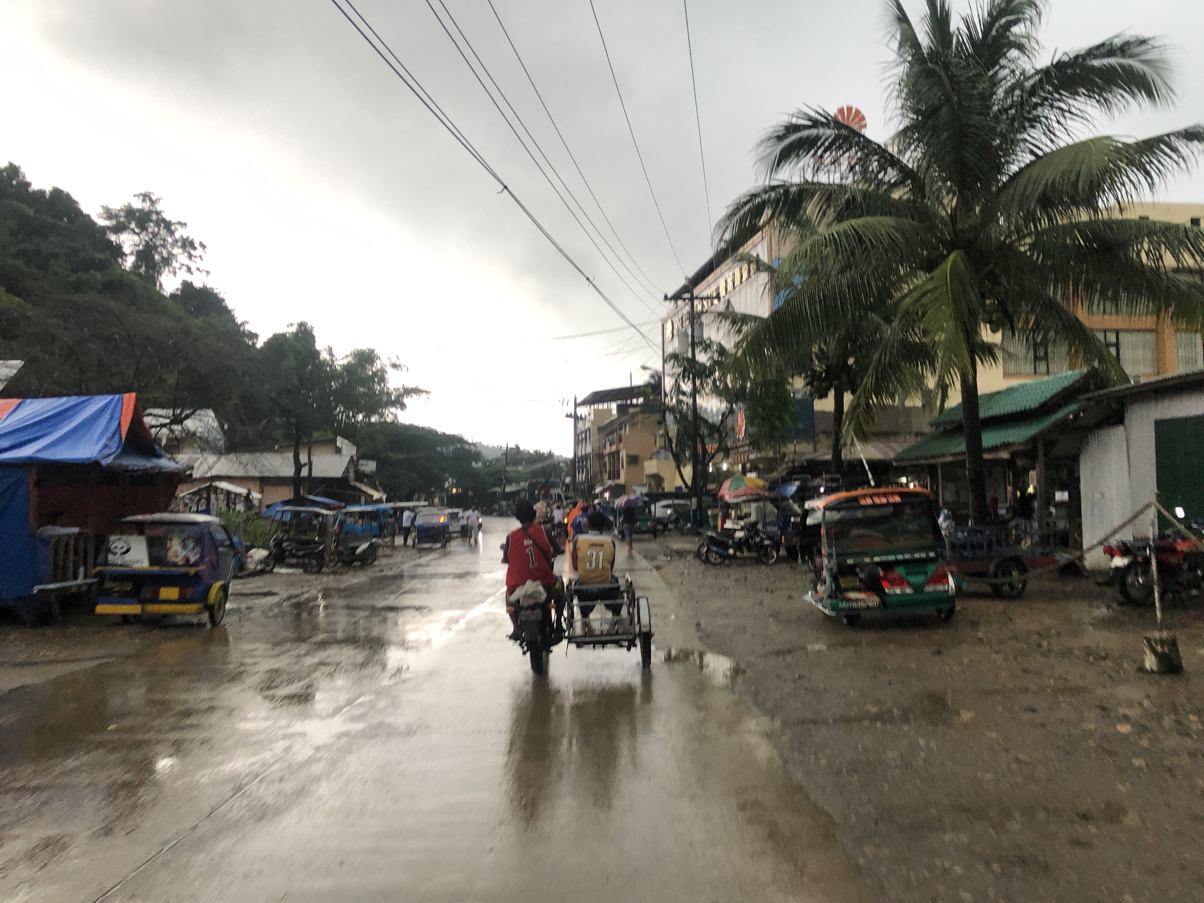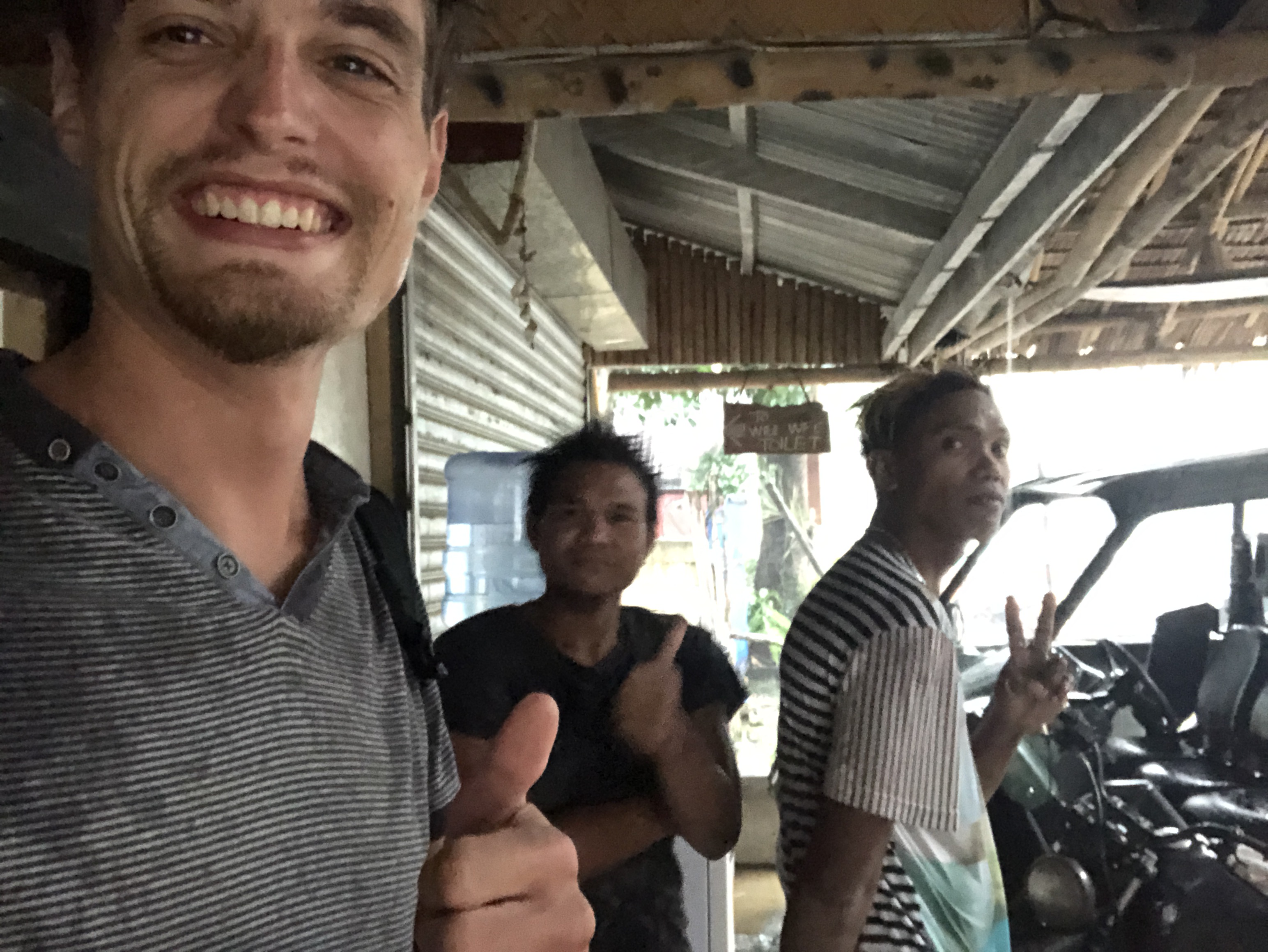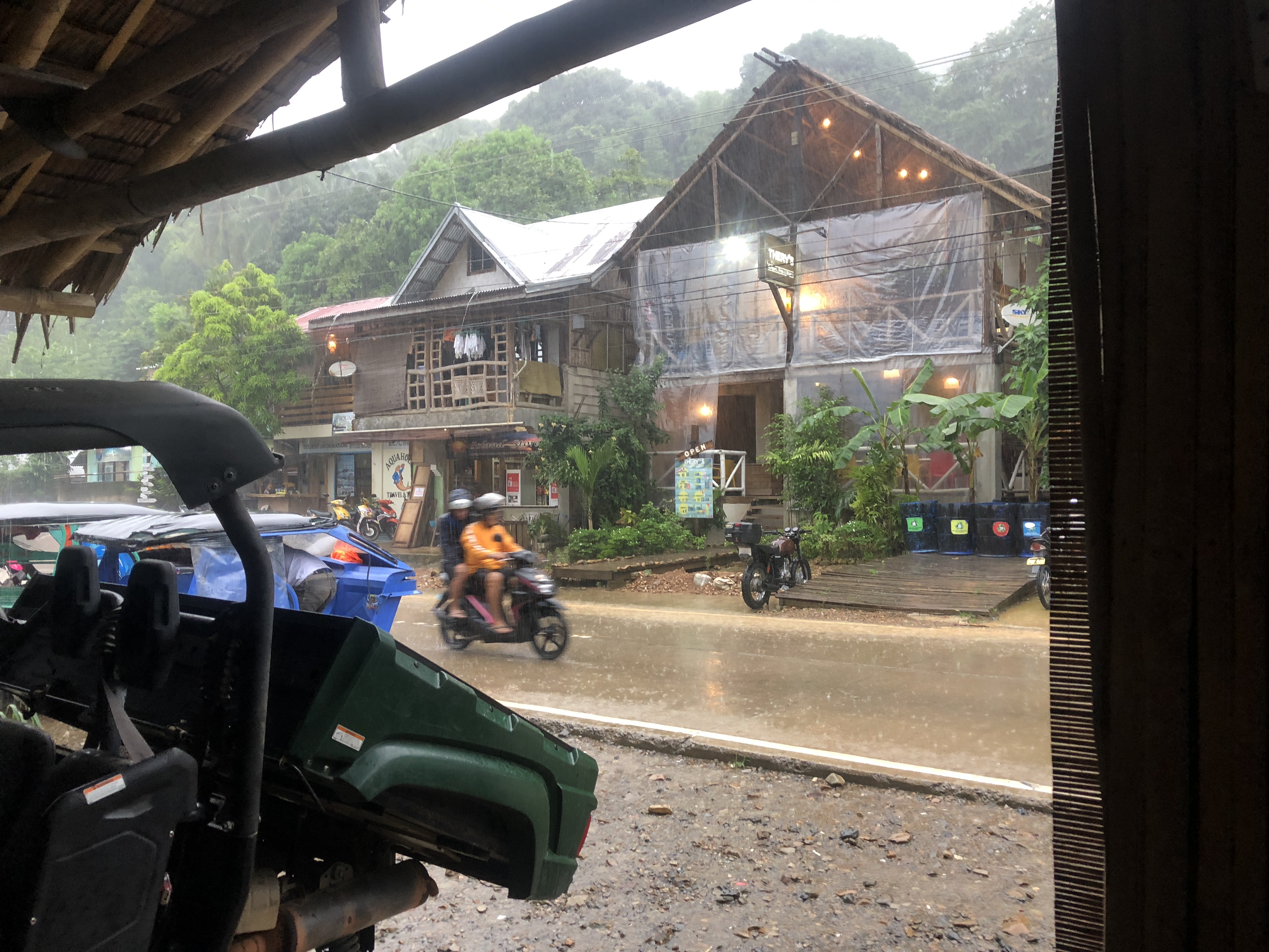 Par chance je tombe sur une cabane en bois. Je rentre, il y a un mec en dessous. Il allume une lampe, m’éclaire et m’accueille. Il bosse pour la sécurité de l’hôtel voisin, il s’appelle Paulo. Un autre scooter s’arrête, trois gars du coin débarquent sous l’abris. Ils font des efforts, parlent anglais. L’occasion de parler, d’apprendre, d’échanger. Jusqu’à l’accalmie.