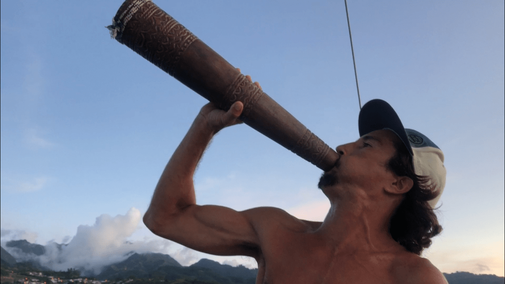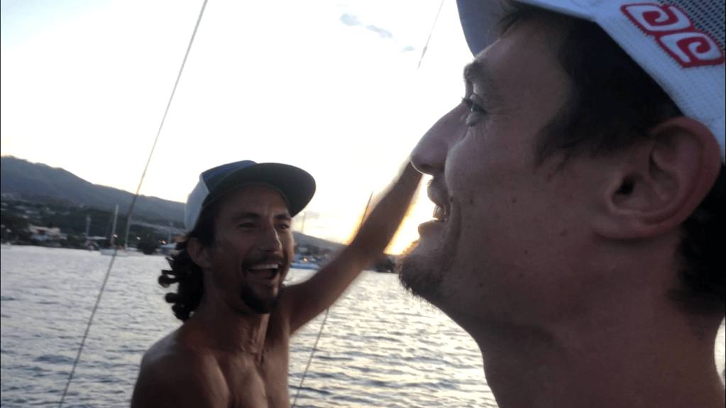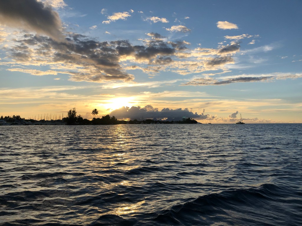 Départ de Tahiti en fin de journée dans un calme absolu, sous le seul bruit du vent qui frotte doucement contre les voiles, et les sons de POU qui signalent notre départ, seuls, sans moteur, dans l’humilité et la conviction.