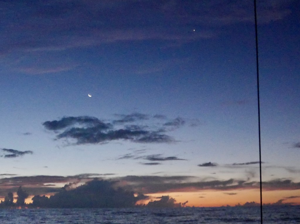 Des millions d’étoiles apparaissent. Des centaines de groupements dans chaque constellation. Une vision incroyable, je n’ai jamais vu un ciel aussi chargé. Il éclaire aussi fort qu’un soir de pleine Lune, alors que celle-ci est déjà couchée. Les constellations elles mêmes n’ont plus de signification tellement les sous groupes d’étoiles qui les composent sont nombreux. Les histoires se racontent à nos esprits apaisés et nos âmes accueillantes. Spectacle exceptionnel qui nous est offert, couchés chacun sur une banquette du bateau.